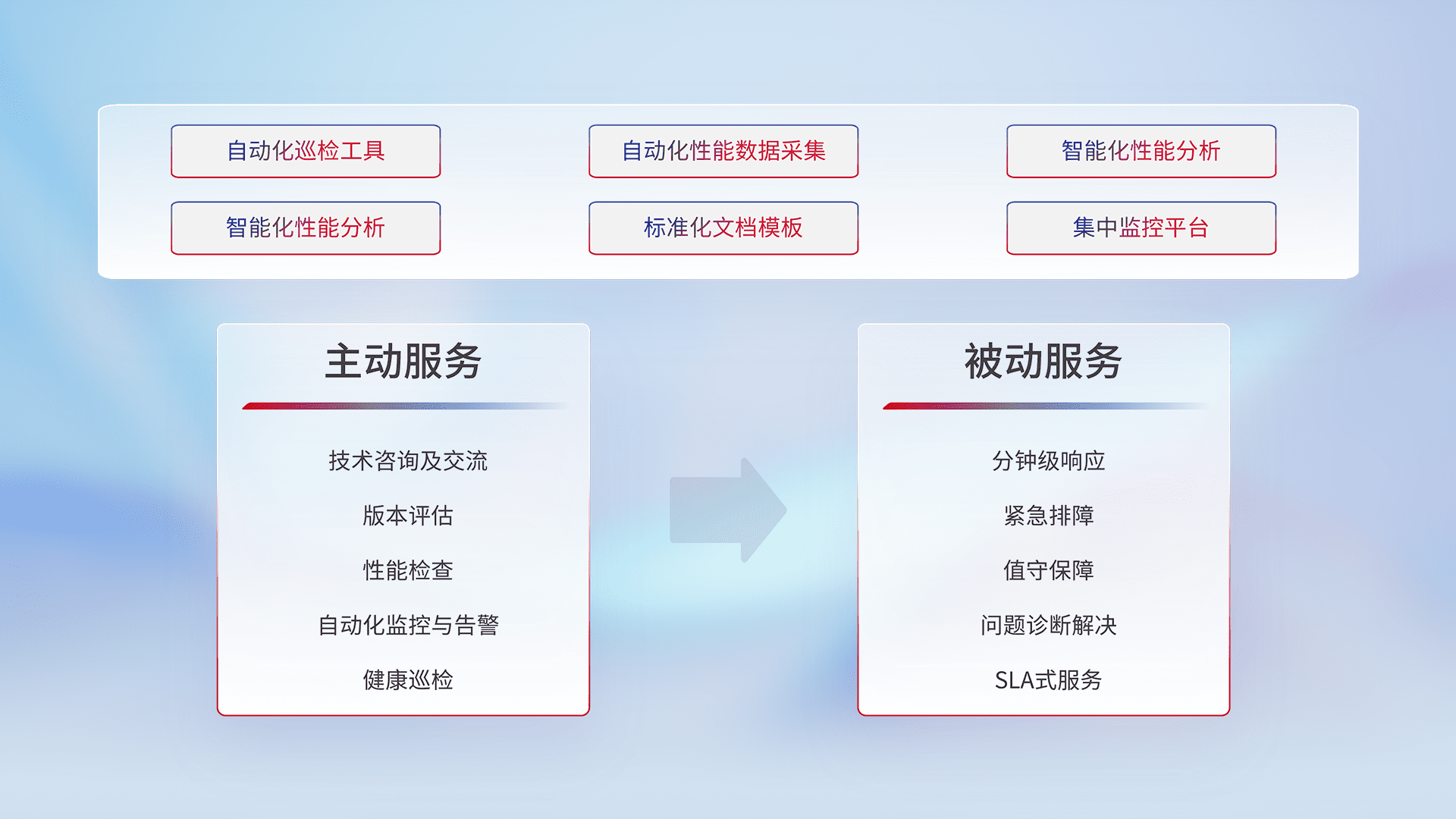 智能化工具和标准化文档,,保障服务质量,,,提供主动服务(包含技术咨询、、、、版本评估、、、性能检查、、自动化监控与告警、、、、健康巡检)和被动服务包含(分钟级响应、、、紧急排障、、值守保障、、、问题诊断解决、、、、SLA服务)。。。