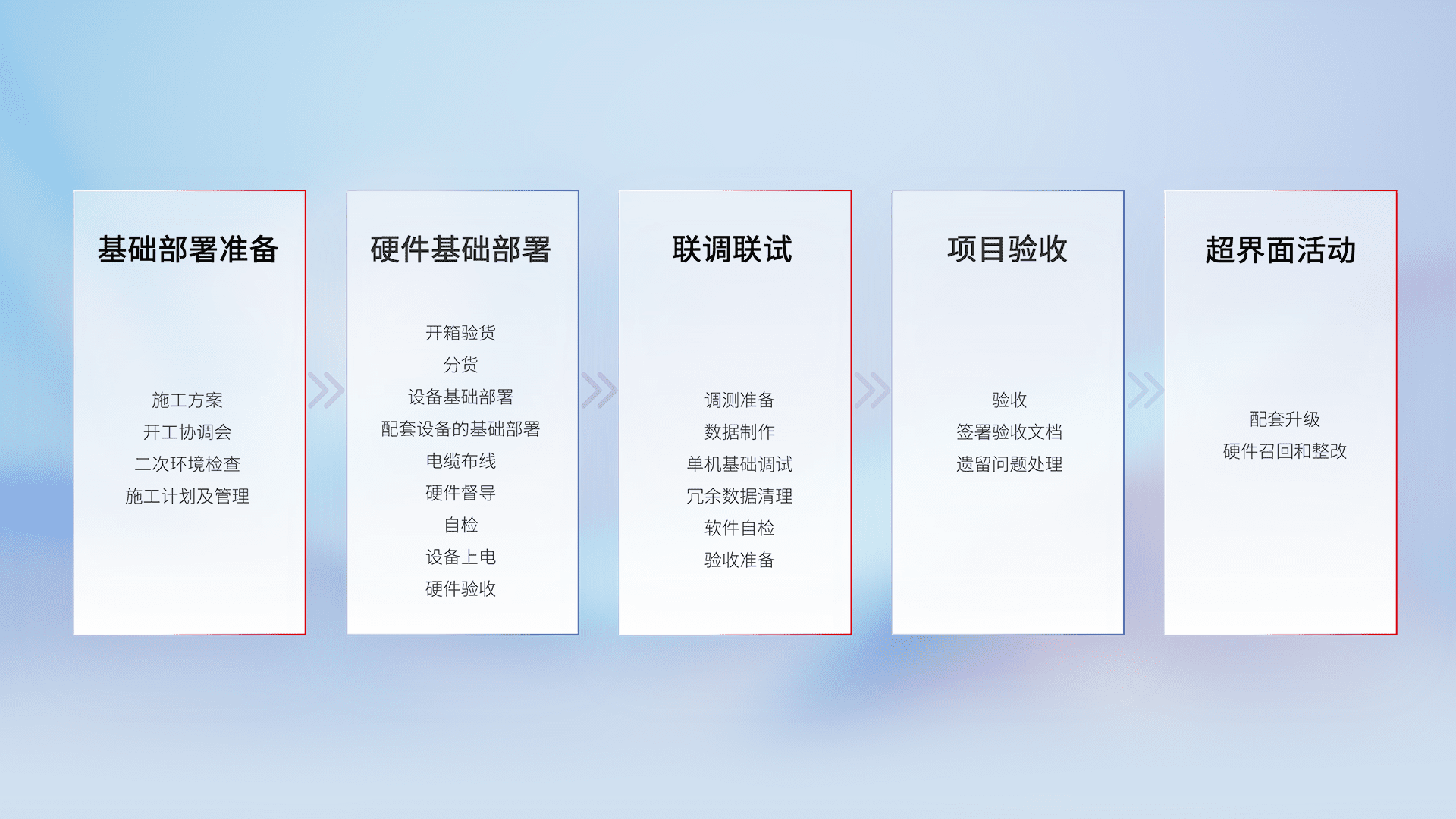 从基础部署准备、、、、硬件基础部署、、联调联试、、、、项目验收、、越界面活动的全过程可追溯,,,,保证施工质量和进度。。。